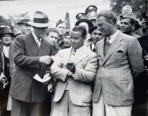 Let’s start with the black-and-white image from that 1935 Masters showing Grantland Rice, Gene Sarazen and Craig Wood. Rice is seen presenting checks to Sarazen and Wood after Sarazen won the 36-hole playoff.