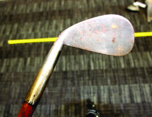 An Iron Club (with thick shaft) as described in the Palace of History is the second of the Spur Toe Group and is a heavy iron with a distinct “spur” on the toe. This spur allowed the club to be “used hammer wise” (Golf, 9 Oct, 1896). By turning the club to align the end of the head behind the ball, a ball in a rut or nestled among stones could be struck with the end of the toe. The grip is also distinctive being a single thickness of coarse “woolen selvedge.” Such clubs are referred today as having a “list” or “listing grip.” Similar wrapped listing isfound under old sheepskin grips. The other rare and unique feature of this club is the incised ring rather than nicking to the top of the hosel. See the photo at the top of this page.